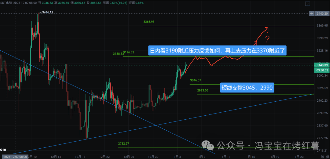 以太坊短期压力关注3190附近,若顺利突破,可进一步留意3370压力。下方支撑依次参考3045与2990。整体思路与比特币一致:中间行情建议右侧参与,左侧挂单可依据上述关键位布局。