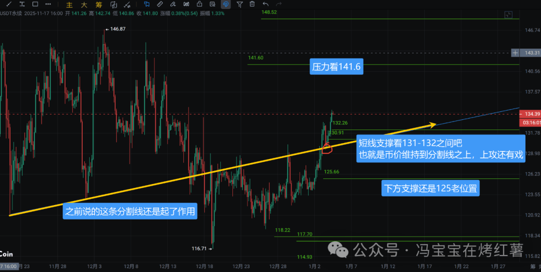Sol此前分析的价格分割线依然有效,当前压力位于141.6,短线区间。只要不跌破此支撑,仍有再次上攻的机会;若跌破,则下一支撑看向125附近。