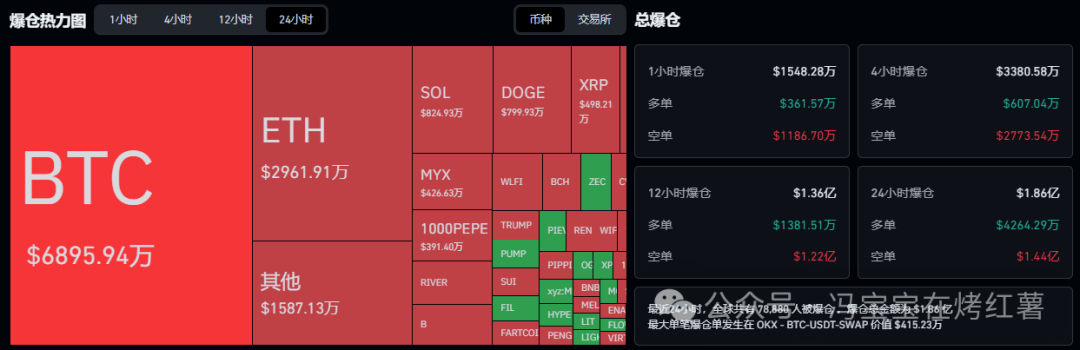 过去24小时全网共有78,880人被被爆仓,爆仓总金额为$1.86亿美元,多单爆仓4264.29万美元,空单爆仓1.44亿美元。