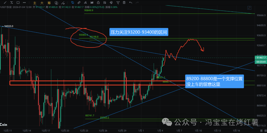 比特币短期压力关注93200-93400区域,观察能否有效突破;下方支撑看89200-88800,关注回落是否企稳。中间走势建议以右侧信号跟进为主,若想提前布局,可在上述关键支撑与阻力附近设置挂单。