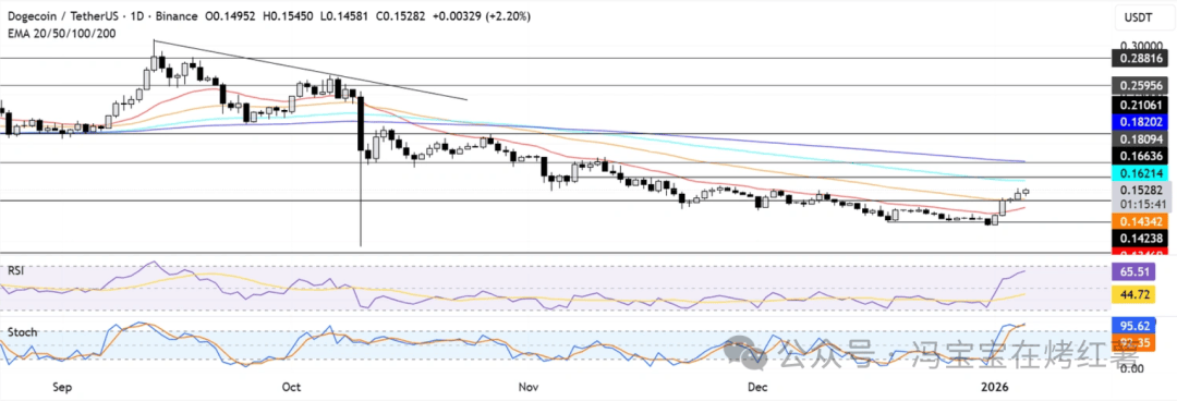 下方支撑方面:首要支撑位在0.142美元附近,若进一步跌破,则可能下探0.121美元。