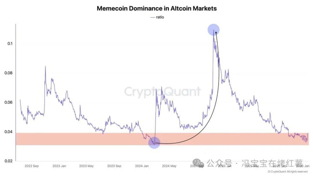 尤其值得注意的是,在经历了数月的低迷后,Meme币相对于山寨币的总市值占比在去年12月曾跌至0.032的历史极低水平(即仅占3%)。