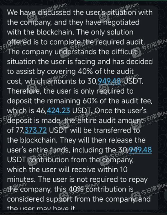 而在与“团队”的聊天中,对方反复劝说她:“这是最后一步、钱马上就能全部释放”、“公司已经帮你承担了一部分费用”,甚至告知公司愿意垫付40%审计费,她只需再补剩下的60%。