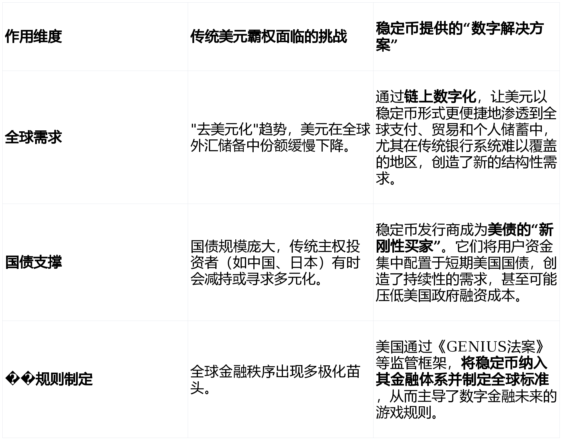 它并非要取代传统的美元,而是作为一种新型的、技术驱动的数字杠杆。它通过创造一个全球性的、24小时不间断的“链上美债循环”,一方面为美国的巨额债务找到了新的、持续的需求来源;另一方面,通过“数字美元化”让美元更深入地嵌入全球经济的毛细血管。同时,美国通过率先立法,掌握了这一新兴领域的规则制定权。