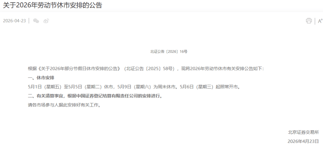 北交所也发布公告,根据《关于2026年部分节假日休市安排的公告》(北证公告〔2025〕58号),现将2026年劳动节休市有关安排公告如下: