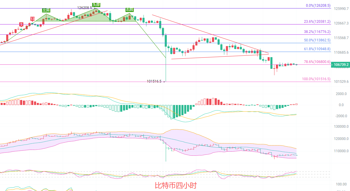 四小时K线一线昨日提到过并且讲了这个位置会是主力的横盘点,只是没有想到波动在千点以内短线没有可操作的空间,MACD出现底部背离的的行情开始放量,DIF和DEA形成金叉K线反而走低,EMA趋势指标整体大空趋势不变,EMA15来到了107650,激进的币友可以以此南下,稳健的币友在109000上方开始布局南下的机会,非专业交易员谨慎开多