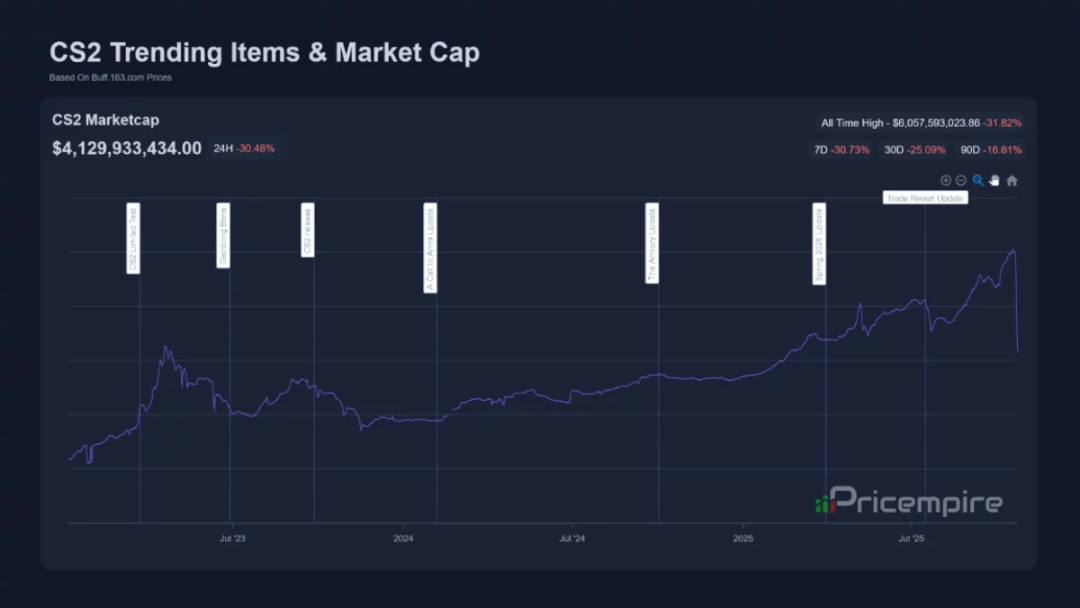 CS 更新的影响有多大呢?科创板日报称,CS 游戏饰品市场估值从59亿美元暴跌至42亿美元,一日蒸发近20亿美元。