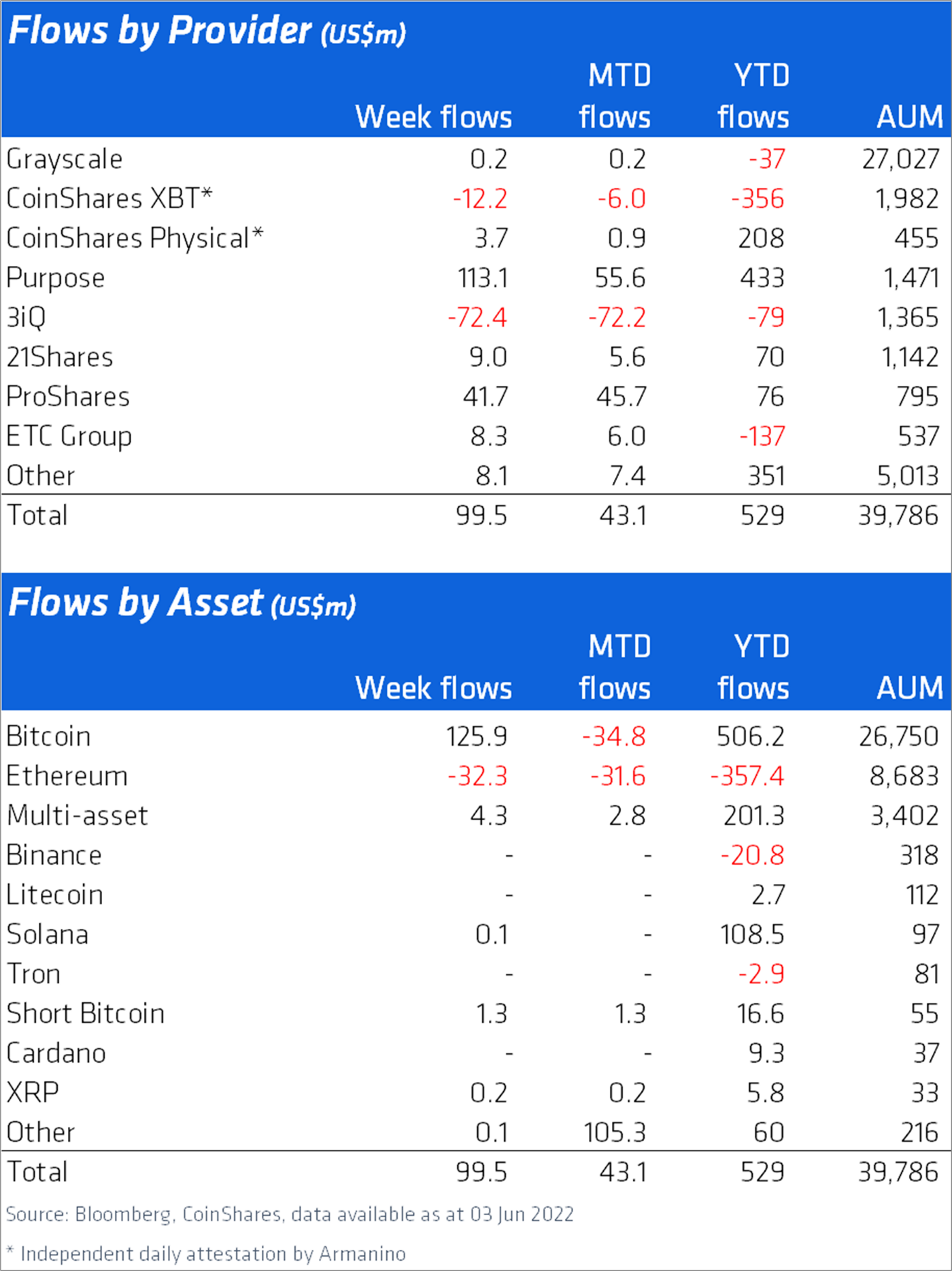 数字资产基金提供商CoinShares的最新报告显示,在截至 6 月 3 日的一周内,专注于比特币的投资基金净流入 1.259 亿美元,使年初以来的净流入总额达到 5.06 亿美元。总体而言,加密基金净流入约 1 亿美元,这意味着比特币基金的流入额弥补了山寨币基金的流出。