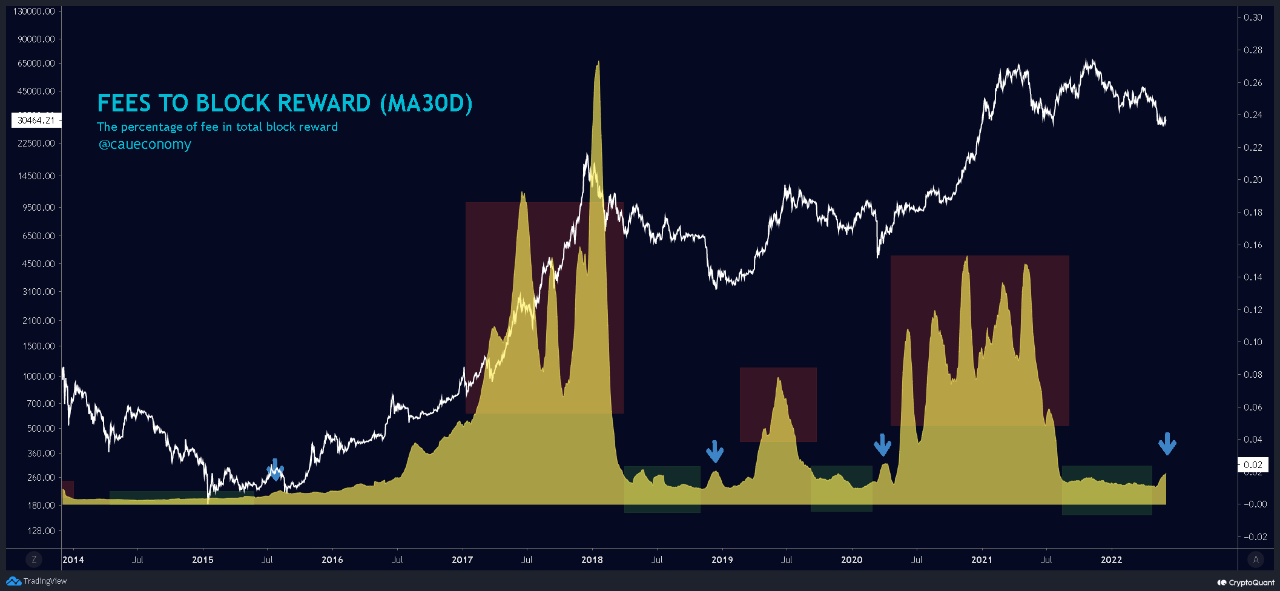 这里的相关指标是“区块奖励费用”(Fees to Block Reward),它衡量比特币交易费用占总区块奖励的百分比。