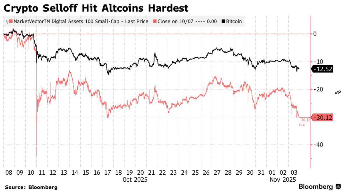 追踪前100大数字资产中排名靠后50名代币的MarketVector指数连续第三个交易日下跌,跌幅达8.8%,部分代币重新下探10月闪崩时的低点。该指数今年已下跌约60%。