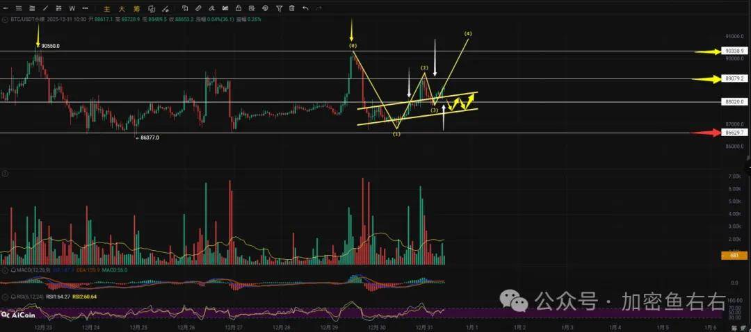 (1)主观认为这里横盘太久了,9万上不去依然是偏空的状态,目标是跌破86500去测试83700。