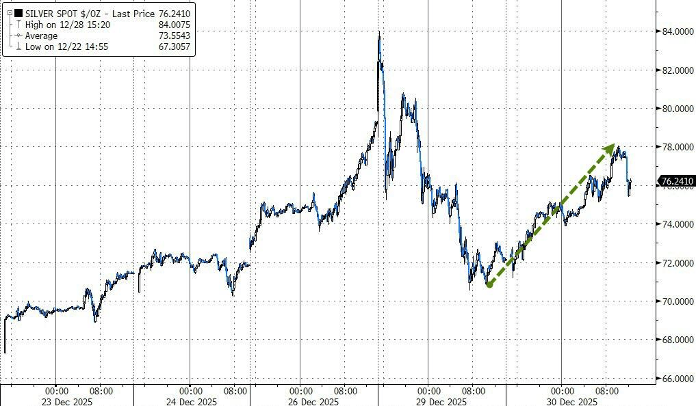 白银反弹更为强劲,盘中最高触及78美元附近,截至纽约尾盘涨幅仍超5%。分析认为这一轮贵金属的剧烈波动,本质上并非趋势反转,而是年末低流动性环境下,拥挤交易集中释放的结果。